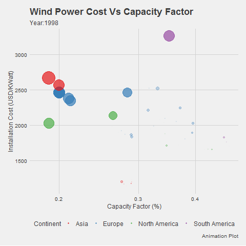 Below I present an animation plot of the cost of wind power vs capacity factor varying across time using ggplot 2 package.